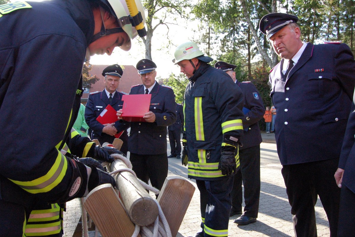 Bevor die Wehr und ihre Gäste zum Grillschinken ins Feuerwehrhaus einrückten, überreichte Heinrich Möller noch eine Ehrenurkunde an den Gerätewart Manfred Ströh, der dieses Amt nun seit zwanzig Jahren inne hat und bedankte sich für seinen Einsatz, gerade auch im Vorfeld der Leistungsbewertung. Nachdem sich alle gestärkt hatten, bedankte sich Bürgermeister Ulfert Geertz, selber aktives Mitglied der Feuerwehr, bei den Kameraden für ihre Einsatzbereitschaft. Schließlich überreichte der Kamerad Michael Stock ein Hohlstrahlrohr, das sich die Atemschutzgeräteträger schon lange gewünscht hatten und das nun seine Firma Baltic Social Consult gespendet hat, an den Wehrführer, der es an die 1. Gruppe übergab.