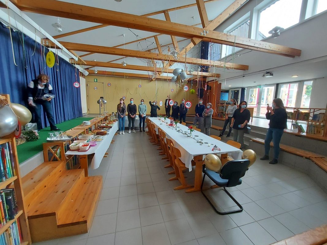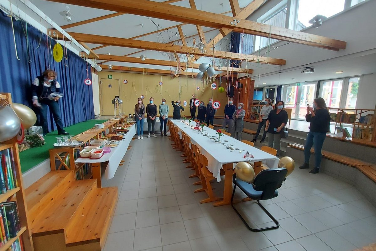 Es stand ein ganz besonderer Tag in der Grundschule Borgstedt an. Nein, es war nicht der Zeugnistag, auch kein Geburtstag und auch nicht der letzte Schultag vor den Ferien. Es war das 40. Dienstjubiläum unserer Frau Haase. Seit 40 Jahren ist sie nun schon Lehrerin und wer glaubt, dass Frau Haase nach so langer Zeit keine Lust mehr auf den Beruf hat, der kennt unsere Frau Haase nicht. Sie geht ihrem Beruf noch immer mit so viel Herzblut und Freude nach, dass Sie unseren Schulalltag jeden Tag aufs Neue in ganz besonderem Maße bereichert und für das gesamte Kollegium ein Vorbild ist. So ein Dienstjubiläum für so eine besondere Lehrerin und Kollegin musste natürlich auch besonders gewürdigt werden. Sprechchöre in der großen Pause, die in ganz Borgstedt zu hören waren, feierliche Worte von der Schulleitung und vom Schulverband sowie eine festlich geschmückte Aula und ein gemütliches Beisammensein im Kollegium brachten Frau Haase zum Staunen.