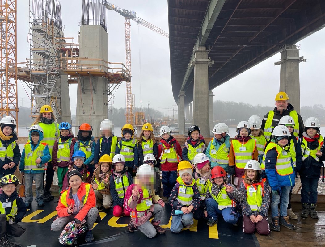 Am 22.03.2024 besuchten unsere Zweitklässler*innen die Baustelle der Rader Hochbrücke. Zunächst wurden wir vom Polier empfangen und mit Helmen und Ausweisen ausgestattet, damit wir die Baustelle betreten durften.