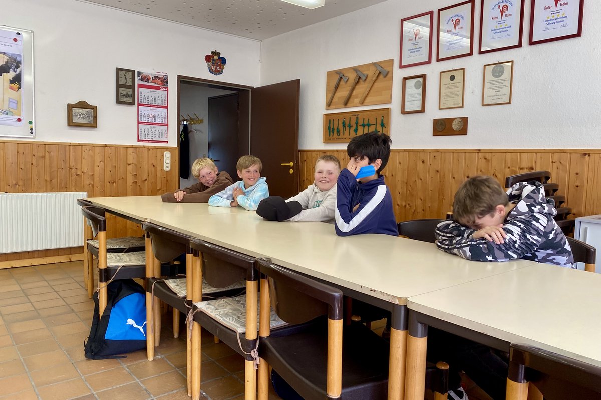 Heute war ein aufregender Tag für die Erdmäuse: Ein Besuch bei der Borgstedter Feuerwehr stand an! Vor Ort wurden sie von gleich vier Feuerwehrmännern begrüßt. Anschließend standen ein Theorie- und ein Praxisteil auf dem Programm: Was sind die Aufgabenfelder der Feuerwehr? Was benötigt ein Feuer, um brennen zu können - und wie kann man ein Feuer dementsprechend löschen? Woraus besteht eine vollständige Feuerwehrmontur und was ist eigentlich alles in einem Feuerwehrauto verstaut?