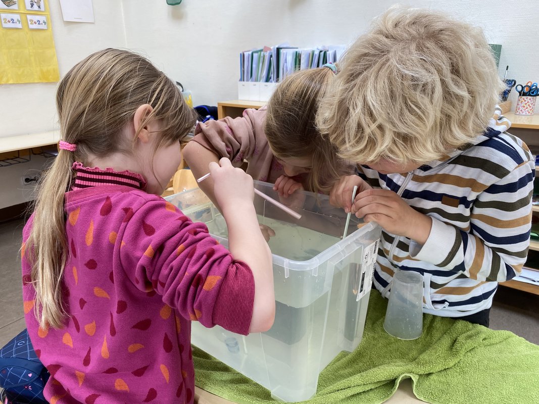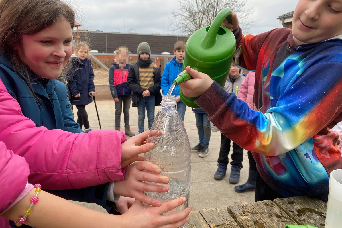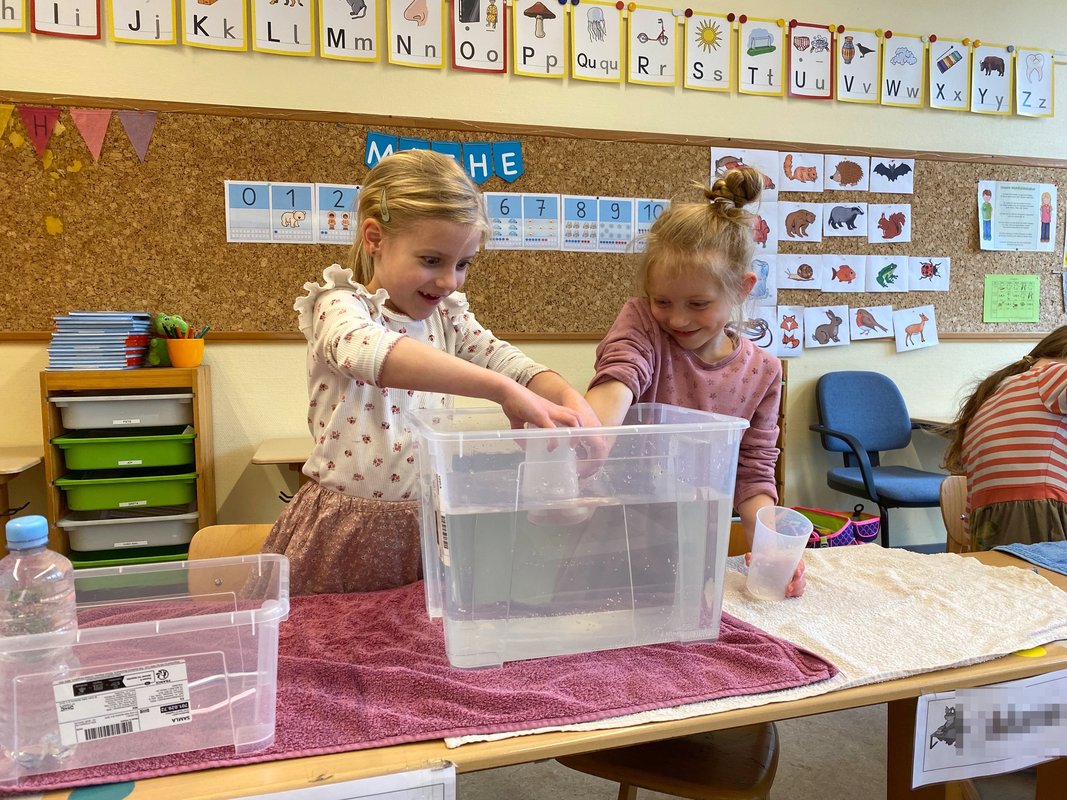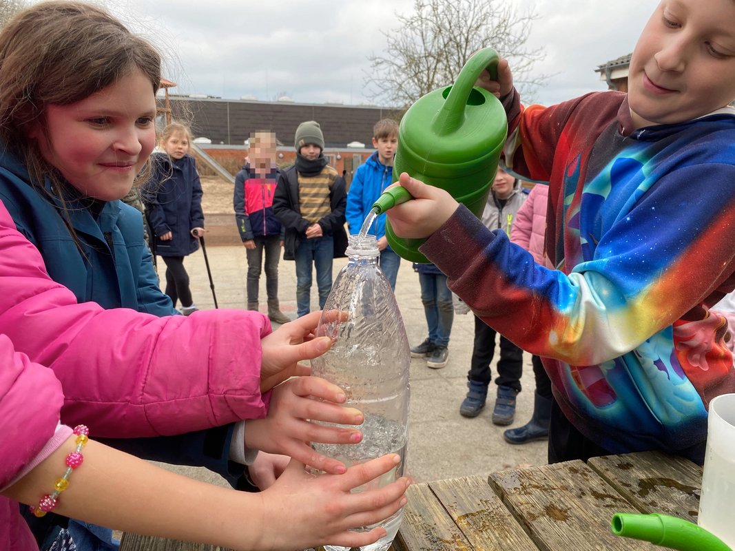 Die Erstklässlerinnen und Erstklässler erfuhren, dass Luft sogar versunkene Schätze aus den Tiefen des Ozeans heben und ganz schön bremsen kann, wenn man versucht, mit einem Fallschirm, der am Rücken befestigt ist, ganz schnell zu laufen. Das Element Erde und die Frage, wie viel Wasser welcher Boden speichern kann, zog die zweite Klasse in ihren Bann. Bei den Drittklässlerinnen und Drittklässlern wurde es nass, denn hier wurde rund um das Thema Wasser geforscht. Heiß her ging es dagegen für die 4. Klasse beim Thema Feuer. Zum Glück löste keines der Experimente die Rauchmelder aus... :)
