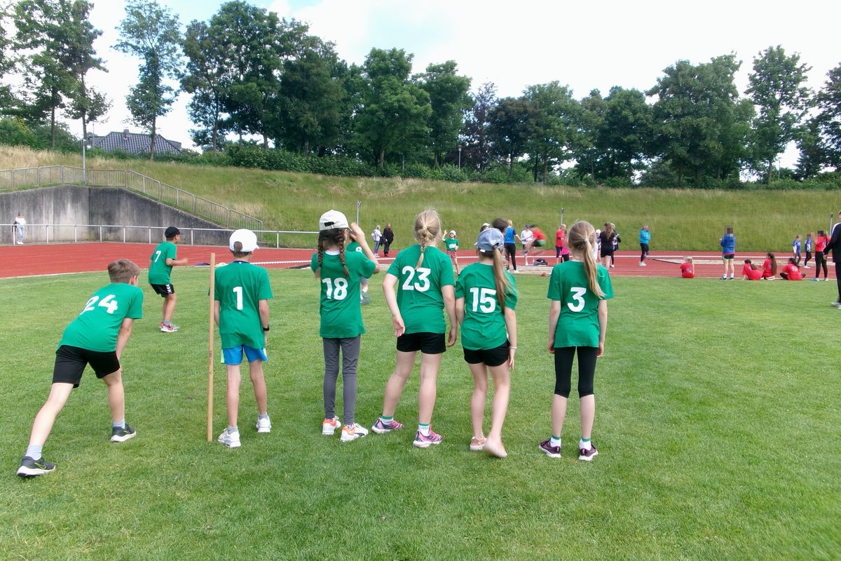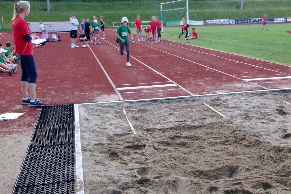 Das Team zog sich die Schulshirts an, verfolgte aufmerksam die Begrüßung, erwärmte sich kurz und dann ging es auch schon los: Mit Schwung wurden beim Hürdenlauf die Bananenkartons überflogen, der Schlagball Richtung Himmel geschickt, der Medizinball über die Langbank gestoßen und neue Rekorde an der Weitsprunganlage aufgestellt. Zu guter Letzt ging es an den Ausdauerlauf. Auch die Sonne ließ sich am heutigen Tag blicken und strahlte mit den Kindern um die Wette.