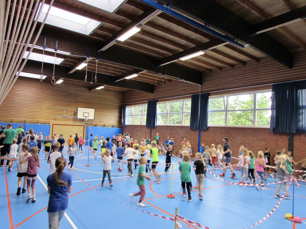 Gleich zu Wochenbeginn ging es mal wieder sehr sportlich bei uns zu: Wir haben am Aktionstag „Laufwunder“ der AOK teilgenommen. Ausgestattet mit unseren Laufwunder-Armbändern kamen wir ganz schön ins Schwitzen, als es galt, 60 Minuten durchzulaufen! Witterungsbedingt konnten wir zwar nicht wie geplant auf dem Schulgelände unsere Runden drehen, allerdings haben wir gezeigt, dass wir auch drinnen gar kein Problem damit haben, neue Rekorde aufzustellen. Zu Beginn gingen die Kinder eine Wette mit Herrn Jaekel ein: Er wettete, dass er mehr Liegestütze machen könne, als es Kinder schaffen würden, die 60 Minuten zu knacken. Als Wetteinsatz wurde ein Eis für alle Kinder eingeloggt. Nach der gemeinsamen Erwärmung durch die Erdmäuse in der Sporthalle ging es los: Klasse 1 und 2 machten das Schulgebäude unsicher (und durften dort ausnahmsweise laufen statt gehen) und Klasse 3 und 4 brachten den neuen Hallenboden ordentlich zum Vibrieren. Für kleine Energiekicks zwischendurch sorgten leckere Bananen, die der Edeka aus Büdelsdorf gesponsert hatte. Mit motivierender Musik sowie vielen anfeuernden und sogar mitlaufenden Eltern drehten am Ende noch 99 Kinder ihre Runden. Für die letzten zwei Minuten kamen auch die Laufenden aus dem Schulgebäude wieder in die Halle und reihten sich ein. Gemeinsam wurden die restlichen Sekunden gelaufen und der Jubel und Stolz war am Ende bei allen groß. Noch größer wurde die Freude allerdings, als Herr Jaekel seine Wette ganz knapp verlor und alle Kinder ihr verdientes Eis bekamen. Wir waren beeindruckt von allen gezeigten sportlichen und unterstützenden Leistungen - bei Groß und Klein, bei 5 und bei 60 Minuten!