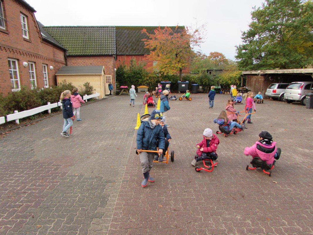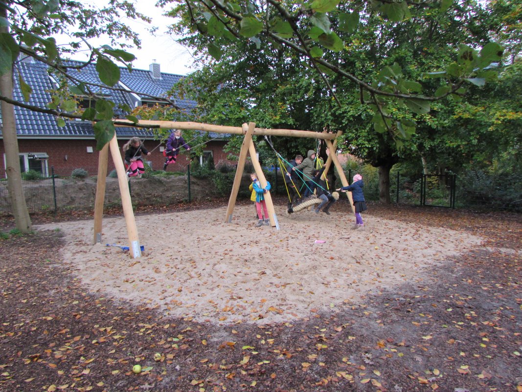 Auf was freuen sich Kinder in der Schule am meisten? Auf die Pausen! Und noch mehr Freude bereiten die Pausen, wenn es auf dem Schulhof viel Platz und Anlässe zum Spielen gibt. Hier in Borgstedt gibt es nun viele neue solcher Anlässe. Auf dem Gelände des ehemaligen Hausmeistergartens warten eine lang ersehnte Schaukelanlage und ein Seilparcour auf die Kinder. Das alte Klettergerüst, welches schon 30 Jahre auf dem Buckel hatte, durfte in den wohlverdienten Ruhestand gehen. An gleicher Stelle steht nun ein Klettergerüst mit drei Türmen und jeder Menge Möglichkeiten zum Hangeln, Rutschen und Klettern. Heiß her geht es auch auf unserer Pflasterfläche: hier herrscht ein wuseliges Treiben mit verschiedenen Fahrgeräten, Rikschas und Trikes. Wenn das so weitergeht, wird in Zukunft nicht nur vor der Schule, sondern auch auf dem Schulgelände geblitzt. In den ersten Tagen wurden alle Geräte auf Herz und Nieren von den Kindern getestet und für sehr gut befunden. Dem ersten Ansturm haben sie standgehalten