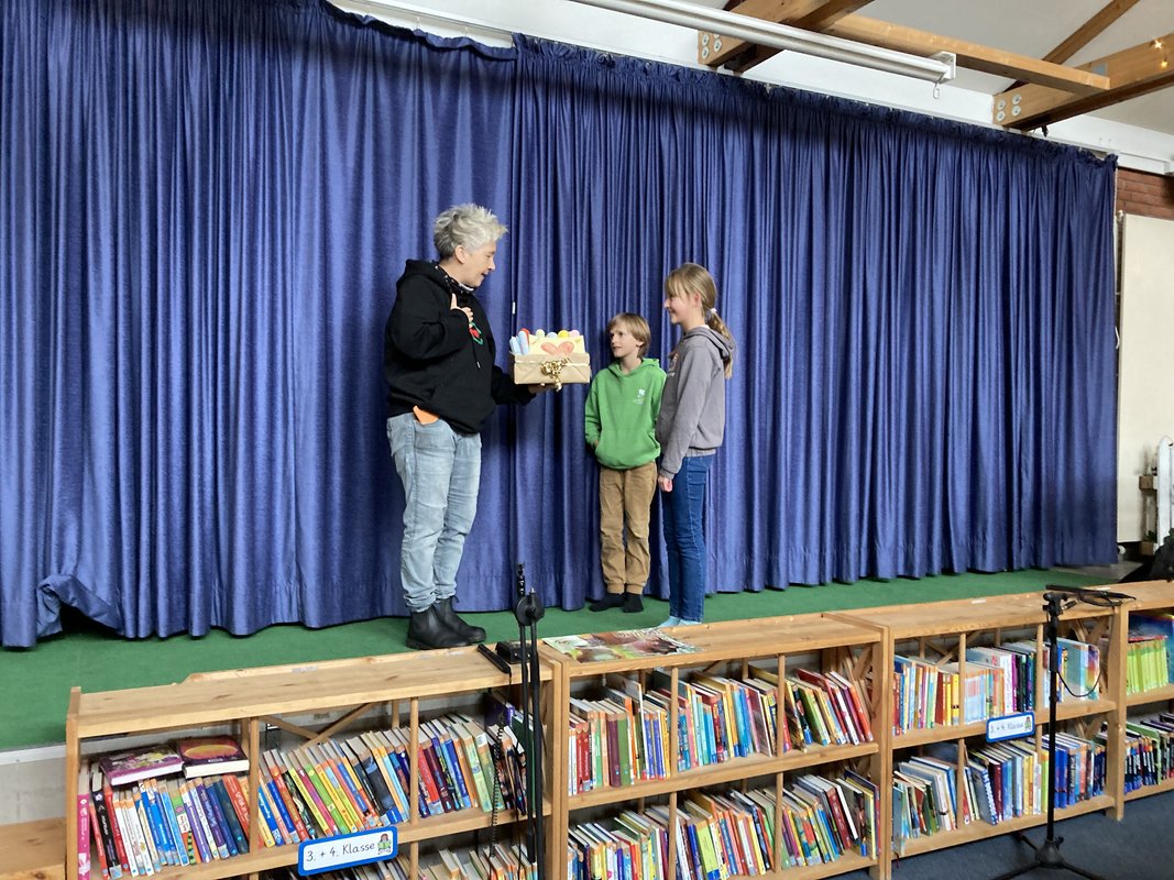 Insgesamt sind 3.252,80€ zusammengekommen, die in der Aula einer Vertreterin der Schutzstation übergeben werden konnten. Die Kinder waren mächtig stolz und das Dankeschön von Frau Rademacher von der Schutzstation sehr herzlich. Frau Rademacher erzählte den Kindern viel Interessantes über die Ernährung von Eichhörnchen, die Aufgaben der Schutzstation und wofür das gesammelte Geld der Kinder eingesetzt werden würde. Außerdem bekam jedes Kind noch eine Eichhörnchen-Postkarte geschenkt. Den Schulflur schmückt nun eine große Dankeschön- Bildkarte der Eichhörnchen-Schutzstation, an welcher die Kinder jetzt stolz vorbeispazieren können.